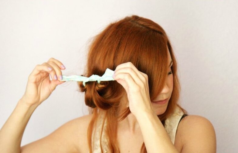Этим способом пользовались еще наши мамы и бабушки. Создать кудри без бигуди и плойки с помощью полосок ткани очень просто, а главное, как говорится, «дешево и сердито». Возьмите какую-нибудь мягкую ненужную ткань и разделите ее на тонкие полоски. Вымытые и слегка влажные волосы разделите на прядки. Возьмите одну прядку и зафиксируйте ее кончик посередине тряпичной полоски, завязав узелок. Затем закрутите прядь наверх и, дойдя до корней волос, снова обвяжите тряпочкой вокруг получившейся «шишечки».